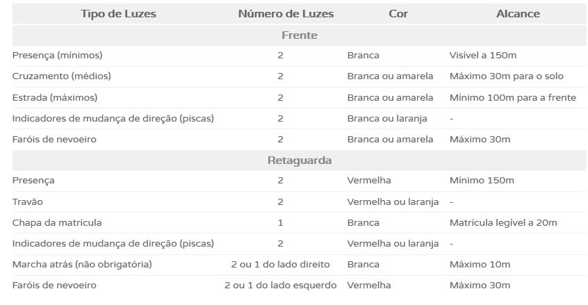 Vê aqui a legislação sobre o uso de luzes! As seguintes tabelas indicam as luzes obrigatórias num veículo, a sua quantidade, cor e alcance.