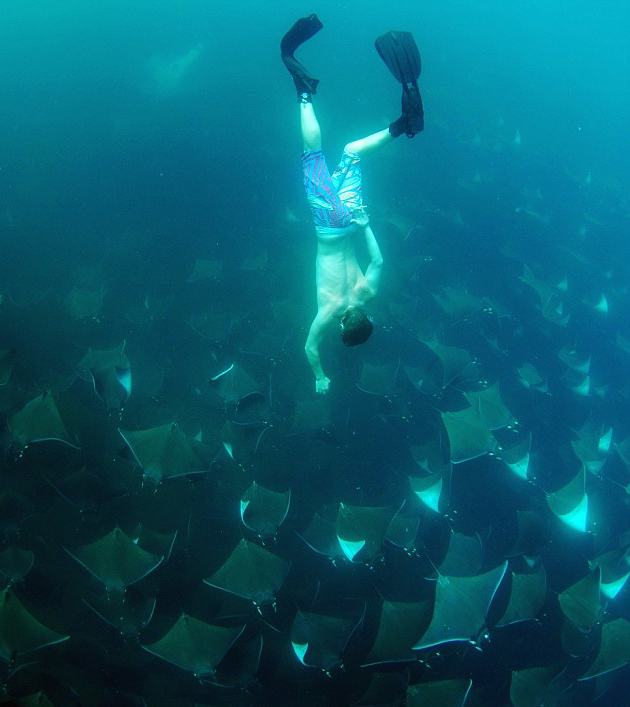 És testemunha de um singular espetáculo natural: a migração anual das chamadas arraias douradas, uma espécie que habita águas tropicais.